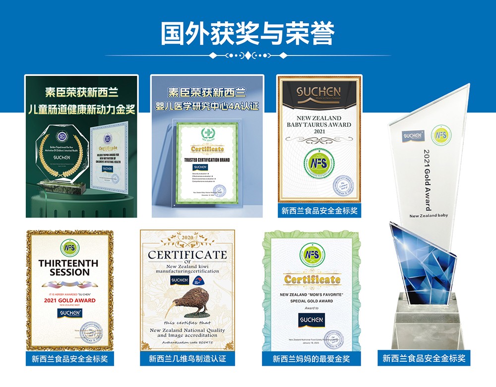 素臣多次斬獲國際健康獎項:被新西蘭營養(yǎng)食品安全研究中心認證為全球健康與安全品牌,獲得新西蘭嬰兒醫(yī)學研究中心的國際幼兒腸道活力科學獎和 4A 認證。