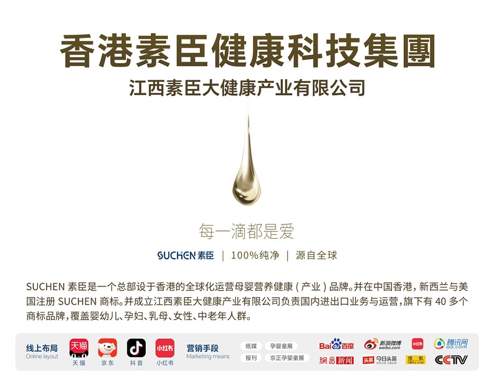 SUCHEN素臣是一個總部設(shè)于香港的全球化運營母嬰營養(yǎng)健康(產(chǎn)業(yè))品牌,用制藥的標準重新定義醫(yī)學功能營養(yǎng)品,深耕醫(yī)學功能營養(yǎng)研發(fā),精選全球頭部原料,為全球家庭提供健康解決方案。并已在中國香港,新西蘭與美國注冊知識產(chǎn)權(quán)。旗下有40多個商標品牌,產(chǎn)品覆蓋嬰幼兒、孕婦、乳母、女性、中老年人群。