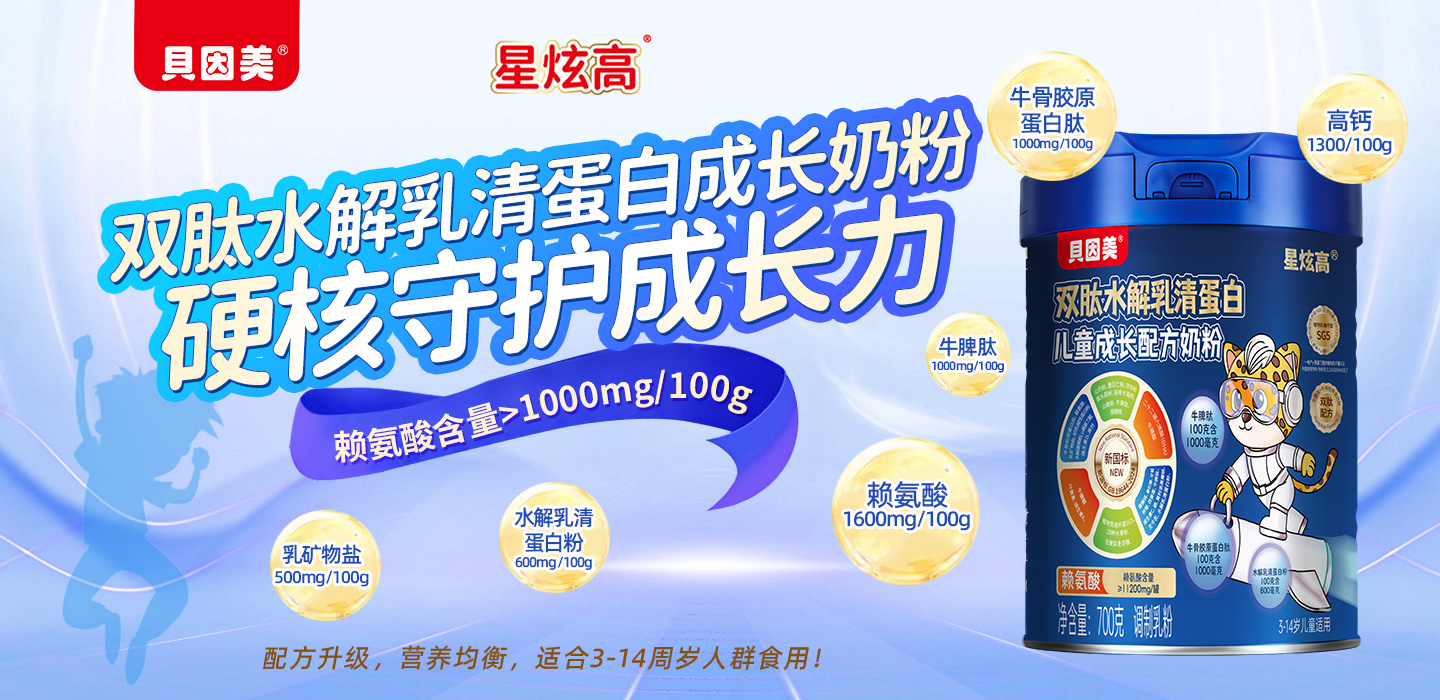 貝因美星炫高兒童成長(zhǎng)配方奶粉,新國(guó)標(biāo)認(rèn)證,GB19644-2024,適合3-14周歲人群食用!嚴(yán)選優(yōu)質(zhì)奶源,源頭把控!賴氨酸含量>1000mg/100g,高含量更營(yíng)養(yǎng)!同時(shí),每100g更添加乳礦物鹽500mg,高鈣1200mg,初乳堿性蛋白粉20mg,水解蛋黃粉10mg,葉黃素162mg,同時(shí)富含多種維生素和礦物質(zhì),均衡營(yíng)養(yǎng)配比,好消化好吸收,守護(hù)成長(zhǎng)健康!