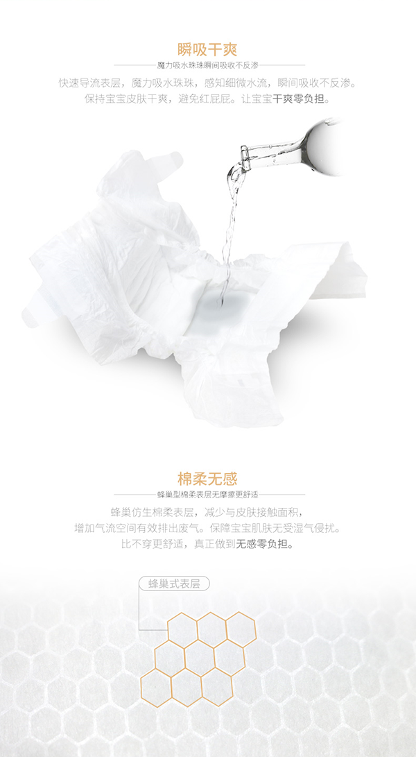 無紡布面料:精選極致柔軟穿孔無紡布面料,清爽透氣,質地輕柔,有效吸收尿液和稀便,給寶寶zui大限度的柔軟體驗。