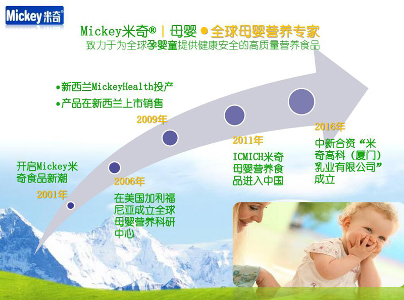米奇·母嬰專注孕嬰營養(yǎng)品、嬰幼兒輔食/奶粉等孕嬰食品和嬰幼兒用品等系列母嬰產(chǎn)品的研發(fā)、生產(chǎn)和銷售,以全球化全產(chǎn)業(yè)鏈、互生再生共生構(gòu)筑國際生態(tài)體系,致力于為母嬰提供健康、安全的營養(yǎng)食品和用品,在美國、新西蘭、臺灣等國家和地區(qū)同步上市。