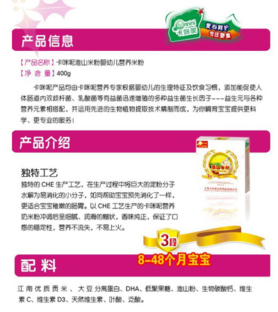 卡咪呢有機米粉系列是專為中國寶寶設(shè)計的營養(yǎng)輔食,選用有機大米,科學(xué)搭配維生素AD等維生素,還特別添加;撬、DHA、AA等有助智力發(fā)育的營養(yǎng)成分,富含15種營養(yǎng)素,F(xiàn)上海卡咪呢母嬰用品有限公司面向全國空白市場區(qū)域誠招卡咪呢有機米粉代理商。