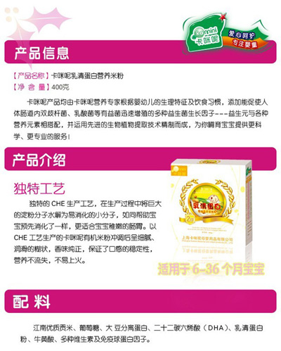 卡咪呢乳清蛋白嬰幼兒營(yíng)養(yǎng)米粉是上海卡咪呢母嬰用品有限公司旗下產(chǎn)品,精選優(yōu)質(zhì)大米制作,特別添加乳清蛋白和益生元,提高寶寶抵抗力,促進(jìn)寶寶changdao的消化吸收,上市以來廣受父母消費(fèi)者的青睞。