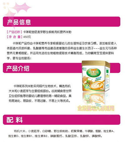 卡咪呢有機(jī)米粉系列是專為中國(guó)寶寶設(shè)計(jì)的營(yíng)養(yǎng)輔食,選用有機(jī)大米,科學(xué)搭配維生素AD等維生素,還特別添加;撬、DHA、AA等有助智力發(fā)育的營(yíng)養(yǎng)成分,富含15種營(yíng)養(yǎng)素,F(xiàn)上?ㄟ淠啬笅胗闷酚邢薰久嫦蛉珖(guó)空白市場(chǎng)區(qū)域誠(chéng)招卡咪呢有機(jī)米粉代理商。