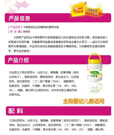 卡咪呢有機米粉系列是專為中國寶寶設計的營養(yǎng)輔食,選用有機大米,科學搭配維生素AD等維生素,還特別添加牛磺酸、DHA、AA等有助智力發(fā)育的營養(yǎng)成分,富含15種營養(yǎng)素,F(xiàn)上?ㄟ淠啬笅胗闷酚邢薰久嫦蛉珖瞻资袌鰠^(qū)域誠招卡咪呢有機米粉代理商。