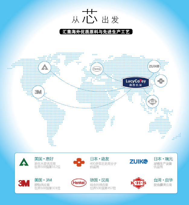 LUCYCAREY露茜凱瑞紙尿褲選用全球頂尖供應(yīng)商的紙尿褲原材料:住友、三大雅高分子吸水材料;美國(guó)3M魔術(shù)貼;德國(guó)萊卡松緊帶;美國(guó)進(jìn)口原生木漿;德國(guó)漢高粘合劑;美國(guó)、日本進(jìn)口無(wú)紡布;進(jìn)口超柔軟透氣底膜等。另外,全世界zui先進(jìn)的全自動(dòng)紙尿褲生產(chǎn)線,年產(chǎn)銷數(shù)億片紙尿褲的成熟的生產(chǎn)制造團(tuán)隊(duì),確保產(chǎn)品高品質(zhì)。