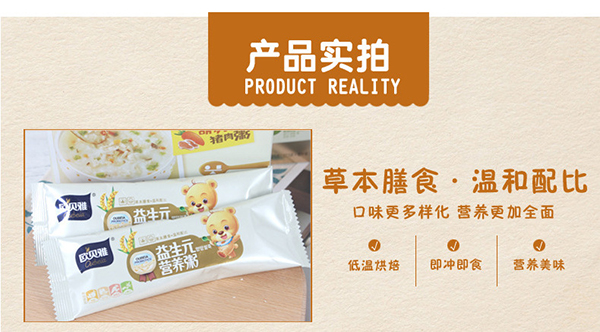 歐貝雅寶寶營養(yǎng)粥是廣東麥丹郎食品有限公司推出的嬰幼兒營養(yǎng)健康食品,將傳統(tǒng)的營養(yǎng)米粉和聞名全國的廣東粥品完美結合起來,不但保持了營養(yǎng)米粉原有的營養(yǎng)成分,而且口感更佳,沖水即食、方便快捷,廣受父母消費者的青睞。