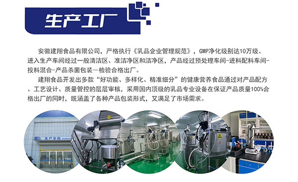 安徽建翔食品作為安徽省唯一調(diào)制乳粉工廠,提供專業(yè)的健康營(yíng)養(yǎng)食品OEM/ODM解決方案。公司擁有先進(jìn)的生產(chǎn)設(shè)備、嚴(yán)格的質(zhì)量控制體系及覆蓋全產(chǎn)業(yè)鏈的超級(jí)供應(yīng)鏈,專注于功能性奶粉的定制化研發(fā)與生產(chǎn)。