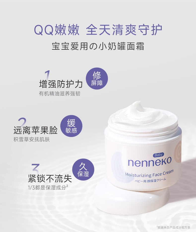 霓奈可寶寶面霜,含精華油特護(hù),72H清爽保濕。添加有機(jī)白池花精油、美洲向日葵精油等,有機(jī)精油,滋養(yǎng)強(qiáng)韌,增強(qiáng)防護(hù)力;積雪草安撫肌膚,舒緩敏感,遠(yuǎn)離紅蘋果臉;多重保濕成分,持久滋潤(rùn),長(zhǎng)效呵護(hù)。