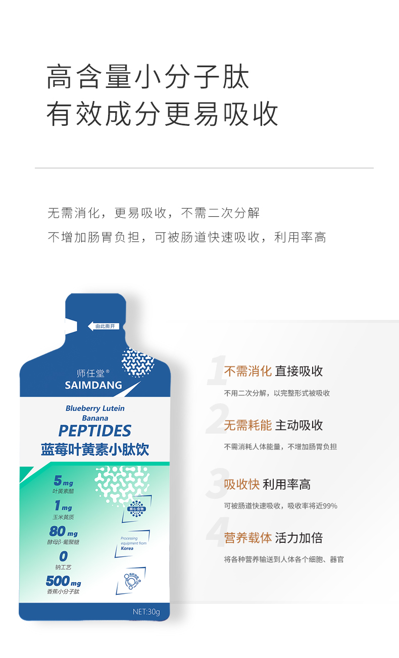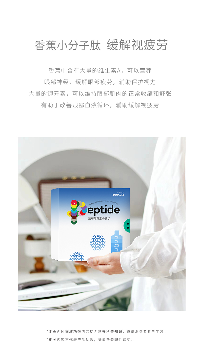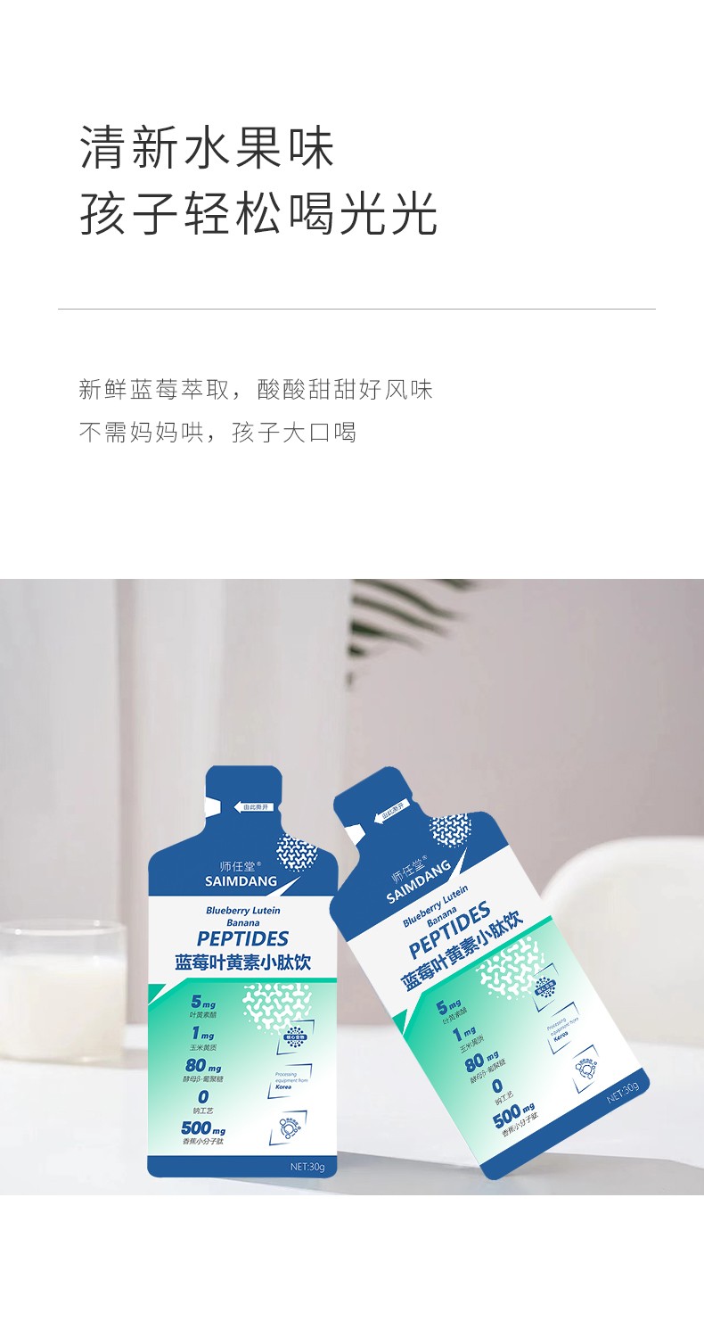 師任堂藍(lán)莓葉黃素小肽飲,少年兒童專研配方,“葉黃素酯+玉米黃質(zhì)”5:1黃金比例,科學(xué)護(hù)眼。搭配藍(lán)莓、低聚果糖(益生元)、酵母β-葡聚糖,特別添加香蕉小分子肽,多種營(yíng)養(yǎng)協(xié)同補(bǔ)充,加倍養(yǎng)護(hù),抵御強(qiáng)藍(lán)光,滿分護(hù)視力!高含量小分子肽,成分更易吸收,不增加腸胃負(fù)擔(dān)。