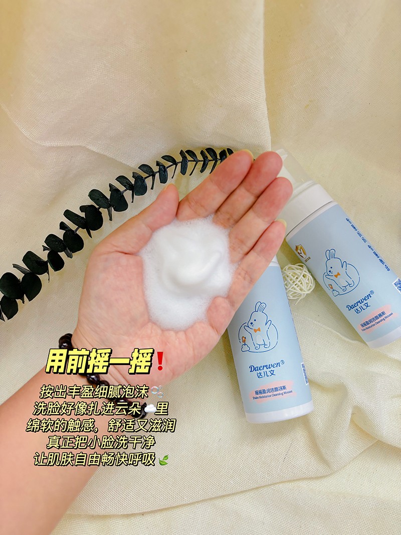 達(dá)兒文搖搖盈潤(rùn)潔面慕斯,潔面新體驗(yàn),敏感肌友好。綿密泡沫,去污滋養(yǎng),兒童專用,無淚配方。