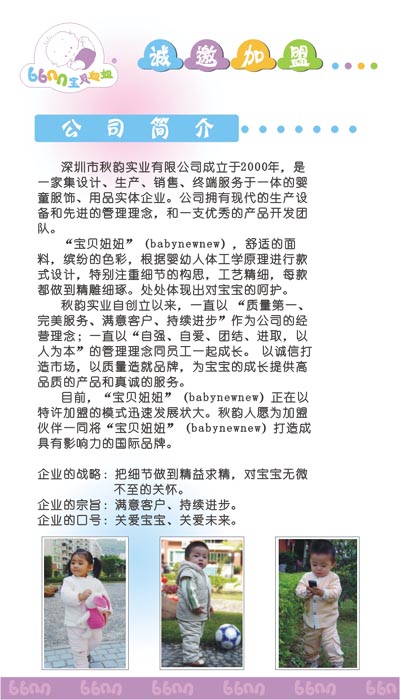 深圳市秋韻實業(yè)有限公司成立于2000年,是一家集設計、生產(chǎn)、銷售、終端服務于一體的嬰童服飾、用品實體企業(yè)。公司擁有現(xiàn)代的生產(chǎn)設備和先進的管理理念,和一支優(yōu)秀的產(chǎn)品開發(fā)團隊。