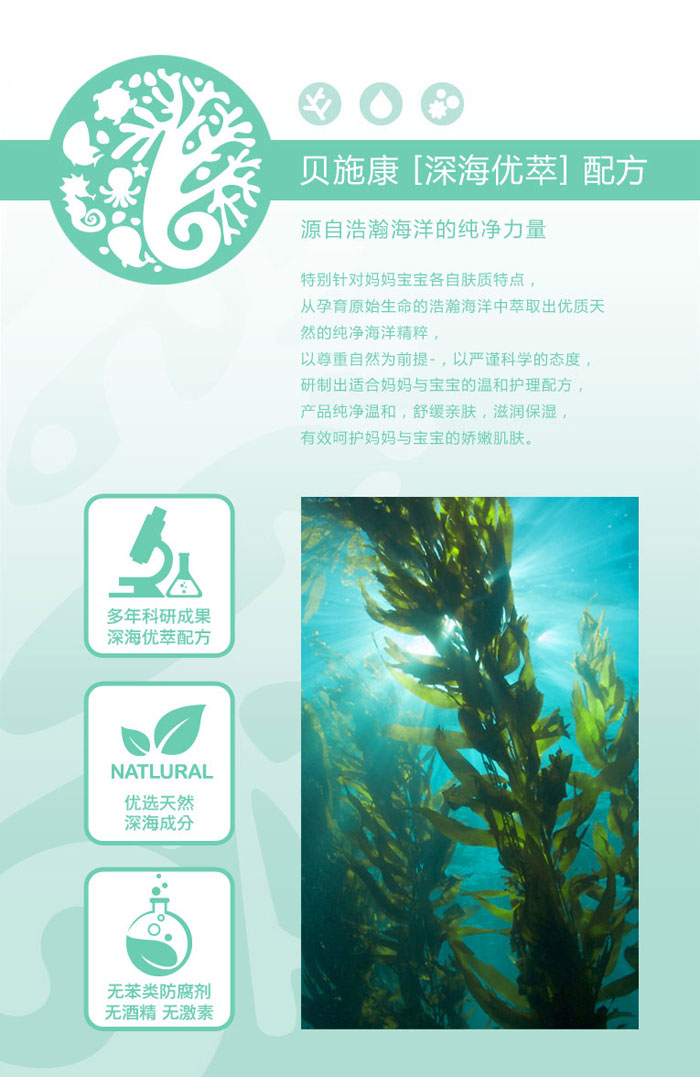 貝施康從浩瀚深海中發(fā)現(xiàn)護(hù)膚能量,依托國際一流科研技術(shù),以尊重自然環(huán)境為宗旨,源源不斷為寶寶和媽媽的肌膚研制出天然優(yōu)質(zhì)舒適的護(hù)理產(chǎn)品, 讓寶寶和媽媽享受源自深海的健康守護(hù)。 特別針對(duì)媽媽寶寶各自膚質(zhì)特點(diǎn), 從孕育原始生命的浩瀚海洋中萃取出優(yōu)質(zhì)天然的純凈海洋精粹, 以尊重自然為前提-,以嚴(yán)謹(jǐn)科學(xué)的態(tài)度, 研制出適合媽媽與寶寶的溫和護(hù)理配方, 產(chǎn)品純凈溫和,舒緩親膚,滋潤保濕, 有效呵護(hù)媽媽與寶寶的嬌嫩肌膚。