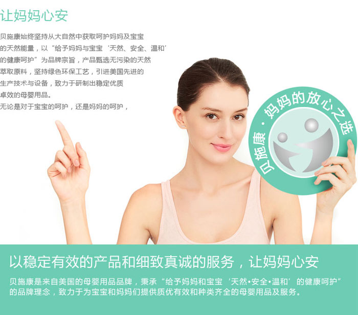 品牌理念:讓媽媽心安 貝施康始終堅(jiān)持從大自然中獲取呵護(hù)媽媽及寶寶的天然能量,以“給予媽媽與寶寶‘天然、安全、溫和’的健康呵護(hù)”為品牌宗旨,產(chǎn)品甄選無污染的天然萃取原料,堅(jiān)持綠色環(huán)保工藝,引進(jìn)美國先進(jìn)的生產(chǎn)技術(shù)與設(shè)備,致力于研制出穩(wěn)定優(yōu)質(zhì)卓效的母嬰用品。無論是對(duì)于寶寶的呵護(hù),還是媽媽的呵護(hù),以穩(wěn)定有效的產(chǎn)品和細(xì)致真誠的服務(wù),讓媽媽心安貝施康是來自美國的母嬰用品品牌,秉承“給予媽媽和寶寶‘天然?安全?溫和’的健康呵護(hù)”的品牌理念,致力于為寶寶和媽媽們提供質(zhì)優(yōu)有效和種類齊全的母嬰用品及服務(wù)。