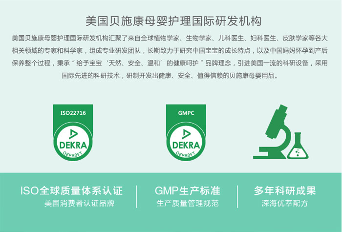 研發(fā)背景:來自美國科研團(tuán)隊(duì)的嚴(yán)苛負(fù)責(zé)全線產(chǎn)品均遵循國際生產(chǎn)標(biāo)準(zhǔn) 給予寶寶安全舒適的呵護(hù) 美國貝施康母嬰護(hù)理國際研發(fā)機(jī)構(gòu)匯聚了來自全球植物學(xué)家、生物學(xué)家、兒科醫(yī)生、婦科醫(yī)生、皮膚學(xué)家等各大相關(guān)領(lǐng)域的專家和科學(xué)家,組成專業(yè)研發(fā)團(tuán)隊(duì),長期致力于研究中國寶寶的成長特點(diǎn),以及中國媽媽懷孕到產(chǎn)后保養(yǎng)整個(gè)過程,秉承“給予寶寶‘天然、安全、溫和’的健康呵護(hù)”品牌理念,引進(jìn)美國一流的科研設(shè)備,采用國際先進(jìn)的科研技術(shù),研制開發(fā)出健康、安全、值得信賴的貝施康母嬰用品。