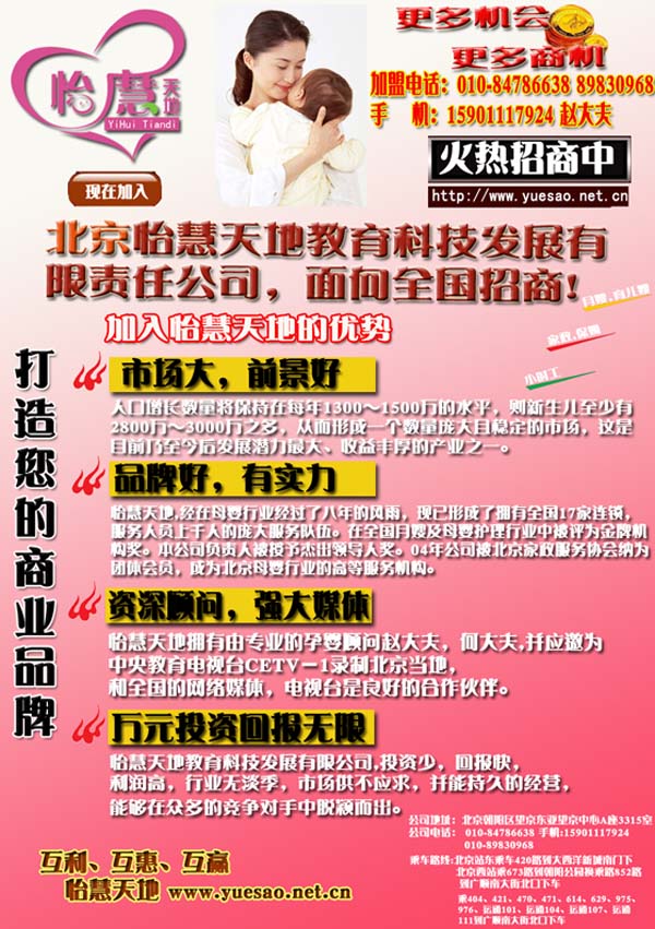 北京怡慧天地教育科技發(fā)展有限責(zé)任公司是一家集婦幼保健咨詢和母嬰服務(wù)為一體的專業(yè)性服務(wù)機(jī)構(gòu)。主要提供孕產(chǎn)期保健咨詢和母嬰護(hù)理服務(wù),并致力于嬰幼兒科學(xué)養(yǎng)育和早期教育的研究。公司聘請(qǐng)了多年從事婦幼保健工作和教育工作的資深人士擔(dān)當(dāng)顧問(wèn),由畢業(yè)于著名醫(yī)科大學(xué)的婦幼專家主持,擁有一支經(jīng)驗(yàn)豐富的高素質(zhì)管理人員和母嬰護(hù)理服務(wù)人員的隊(duì)伍。