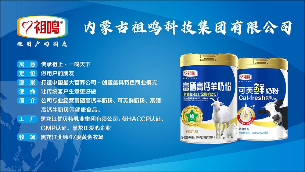 內(nèi)蒙古祖鳴科技集團(tuán)有限公司旗下祖鳴奶粉,做用戶的好朋友。致力于為消費(fèi)者提供營(yíng)養(yǎng)、健康的奶粉、奶貝、奶條,百年傳承、百年品質(zhì) 、百年信譽(yù)、百年精神、傳承祖上、一鳴天下、為偉大祖鳴百年夢(mèng)努力奮斗。