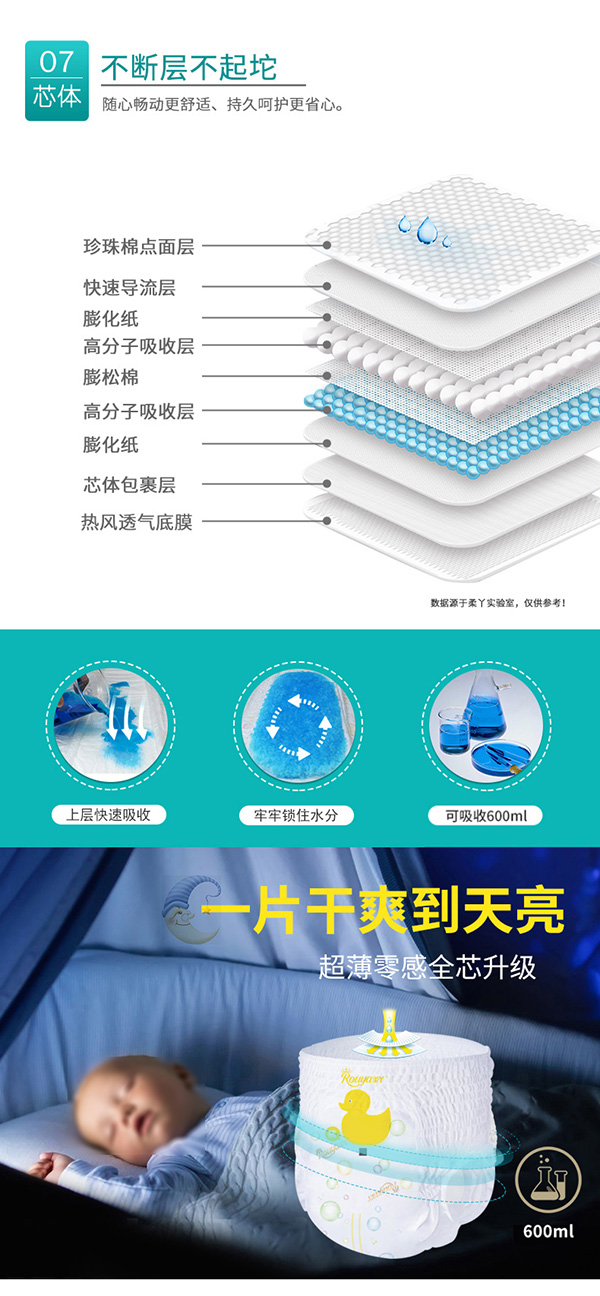 進(jìn)口高分子結(jié)構(gòu),可以吸收約自身重量30倍的水分,保持屁屁持久干爽