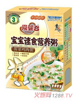 很多父母都知道菠菜中含有豐富的營養(yǎng)物質(zhì),這些營養(yǎng)物質(zhì)對bao--bao的健康很重要,因此父母應給bao--bao適當?shù)难a充一些菠菜。下面小編就給大家推薦一款不錯的嬰童營養(yǎng)輔食--愛嬰谷菠菜大骨粥。愛嬰谷菠菜大骨粥以優(yōu)質(zhì)天然菠菜和優(yōu)質(zhì)大骨為原料,同時又經(jīng)過特殊制作工藝精心制作而成,營養(yǎng)豐富均衡,是理想的嬰童營養(yǎng)輔食。
