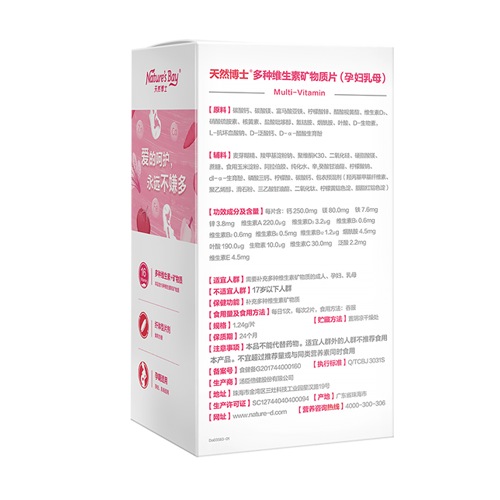 主要原料:碳酸鈣、碳酸鎂、富馬酸亞鐵、檸檬酸鋅、醋酸視黃酯、維生素D3、硝酸硫胺素、核黃素、鹽酸吡多醇、氰鈷銨、煙酰胺、葉酸、D-生物素,L-抗壞血酸鈉、D-泛酸鈣、D-α-醋酸生育酚