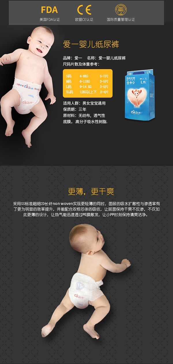 oioio愛(ài)一紙尿褲,是源自新加坡的紙尿褲品牌,品牌秉承“讓愛(ài)始終如一”的品牌理念深受廣大消費(fèi)者喜愛(ài),愛(ài)一品牌的紙尿褲是根據(jù)孩童體質(zhì)及身體曲線科學(xué)立體裁剪,具備舒適綿柔,干爽透氣,高效吸收,雙重防漏等產(chǎn)品特點(diǎn),在未來(lái)我們將不斷創(chuàng)新、完善,致力于為孩童提供健健康舒適的產(chǎn)品,給家長(zhǎng)們提供輕松的育兒體驗(yàn)。