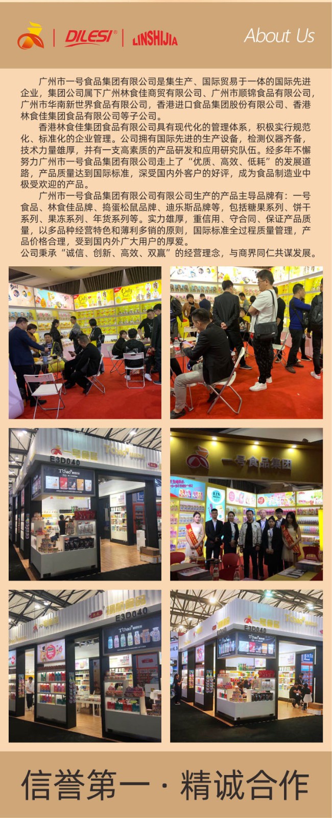 迪樂(lè)斯,廣州市一號(hào)食品集團(tuán)有限公司旗下品牌,它是一家集生產(chǎn)、國(guó)際貿(mào)易于一體的國(guó)際先進(jìn)企業(yè),集團(tuán)公司屬下廣州林食佳商貿(mào)有限公司、廣州市順錦食品有限公司,廣州市華南新世界食品有限公司,香港進(jìn)口食品集團(tuán)股份有限公司、香港林食佳集團(tuán)食品有限公司等子公司。
