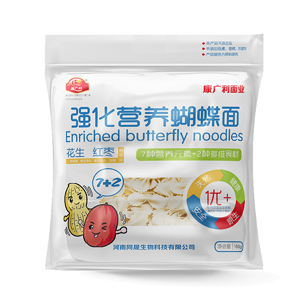 康廣利強化營養(yǎng)蝴蝶面,以優(yōu)質(zhì)面粉為原料,將蔬菜和面進行完美結(jié)合,采用先進工藝精心加工而成,易煮耐煮。經(jīng)獨特用心調(diào)制淡淡的雜糧和蔬菜香味進入蝴蝶面的嚼勁里,讓寶寶的味蕾開始旅行。細滑面體,易消化。7種微量元素+2種多維食材,營養(yǎng)豐富。原生,天然,健康,安全。