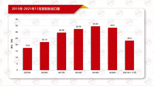 與零售價緩慢上漲相反的是今年奶粉產(chǎn)量呈下滑趨勢。據(jù)國家統(tǒng)計局?jǐn)?shù)據(jù),2021年1-10月,我國奶粉產(chǎn)量76.25萬噸,同比下降2.19%;而據(jù)海關(guān)數(shù)據(jù),2021年1-11月,我國嬰配粉進口量23.3萬噸,較去年下降24.1%,進口嬰配粉下滑較為嚴(yán)重。